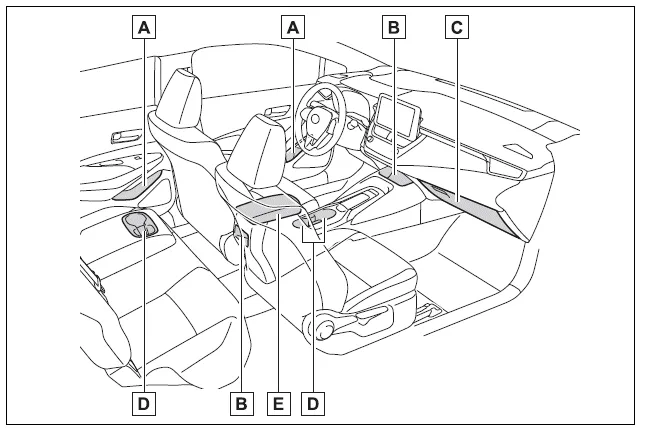 Toyota Corolla (E210) 2019-2025 Owners Manual / Interior features / Using the storage features / Location of the storage features